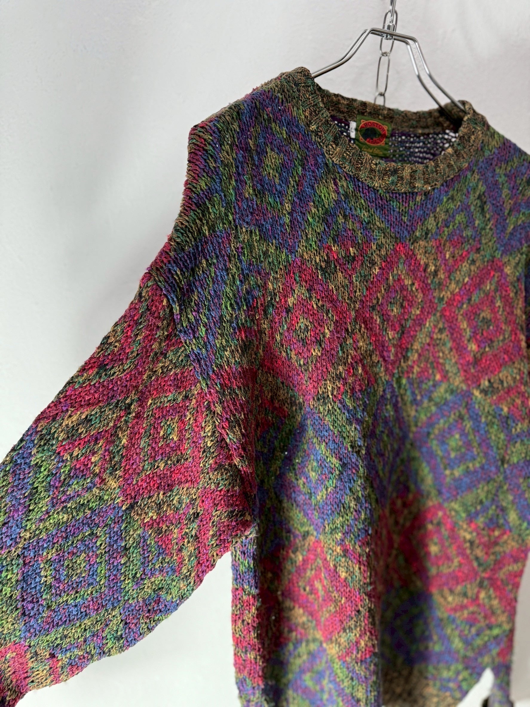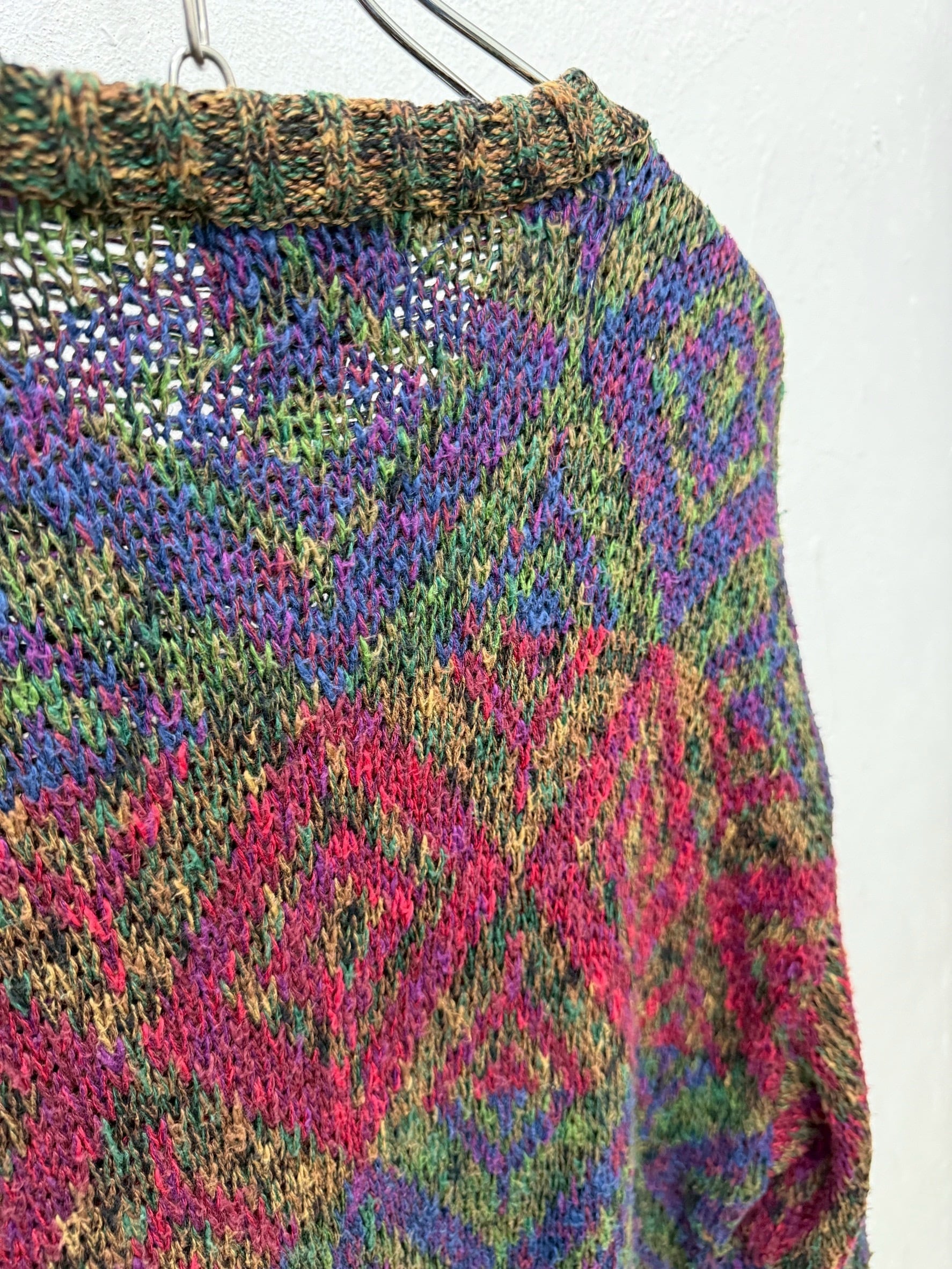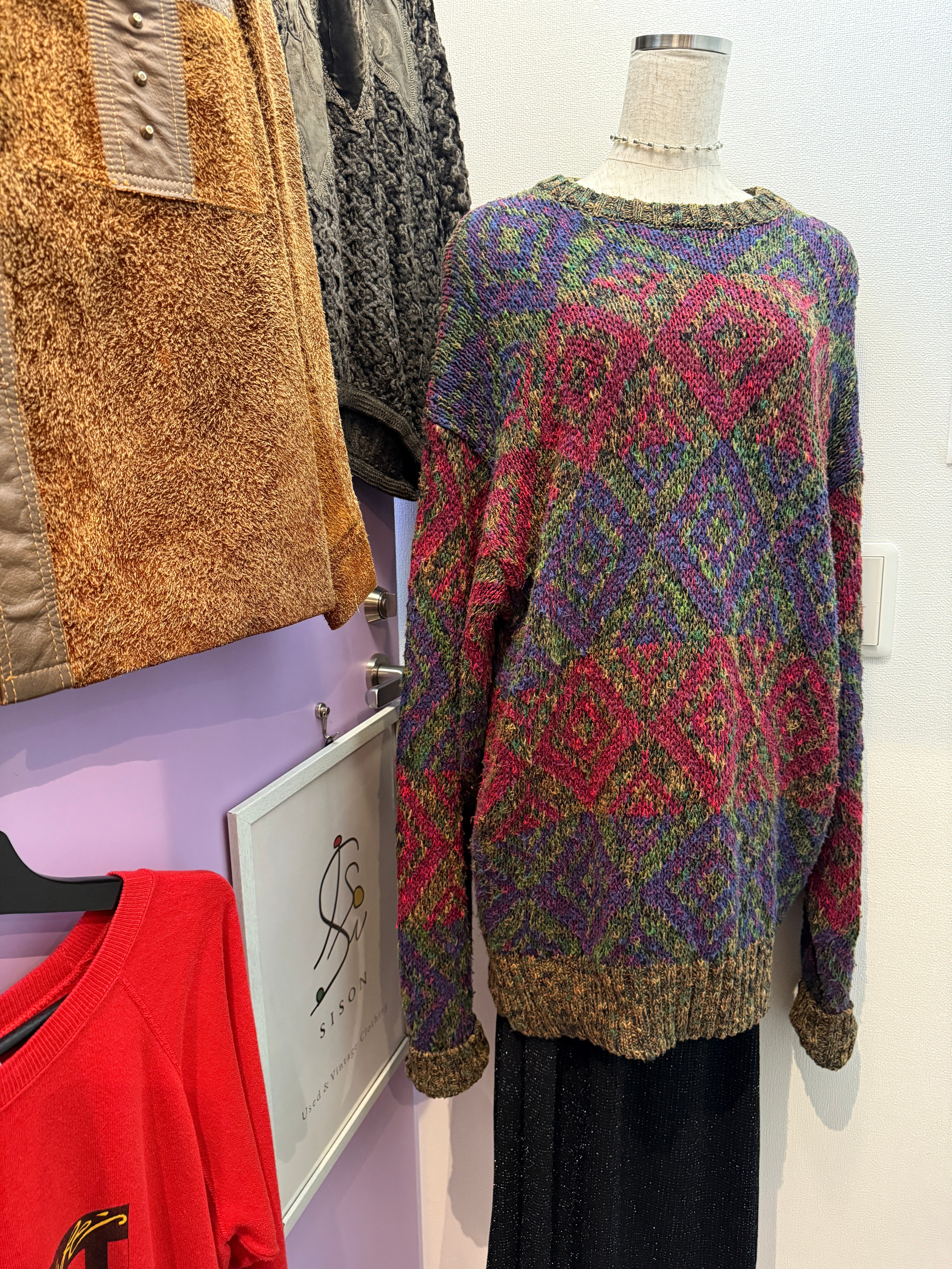 ハイセンスすぎる色使いのミックスヤーンで描かれたダイヤパターンは、視覚的な奥行きと高いアート性を感じます。