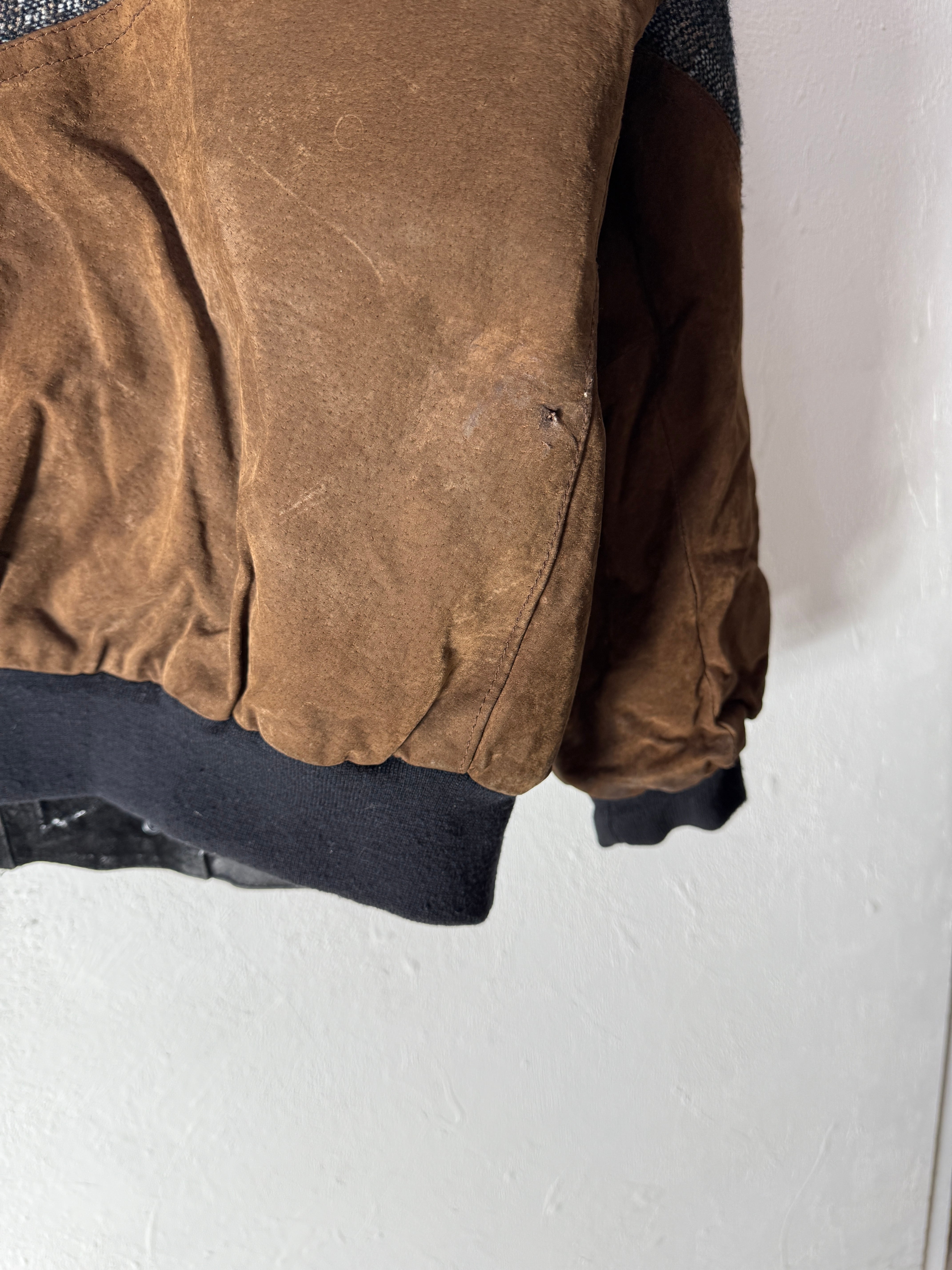 リアルスウェードレザー、ウール混ジャガードニットのを贅沢に組み合わせた、主役アウター。